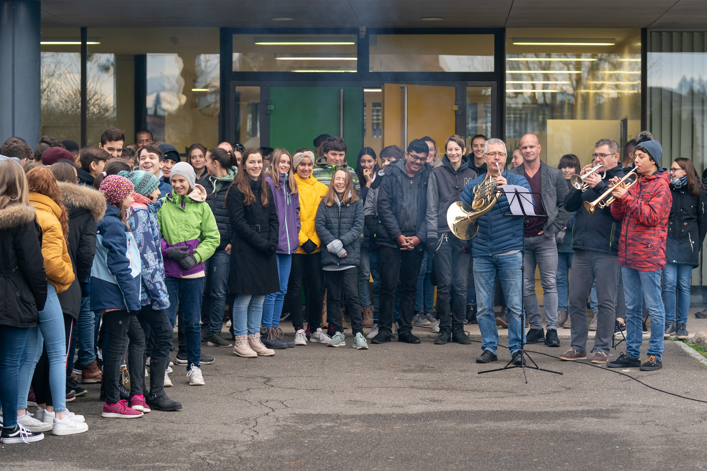 Am letzten Schultag vor den Weihnachtsferien besammelten sich alle Schülerinnen und Schüler der Oberstufe Suhrenmatte vor dem Schulhaus zu einer gemeinsamen Weihnachtsfeier.