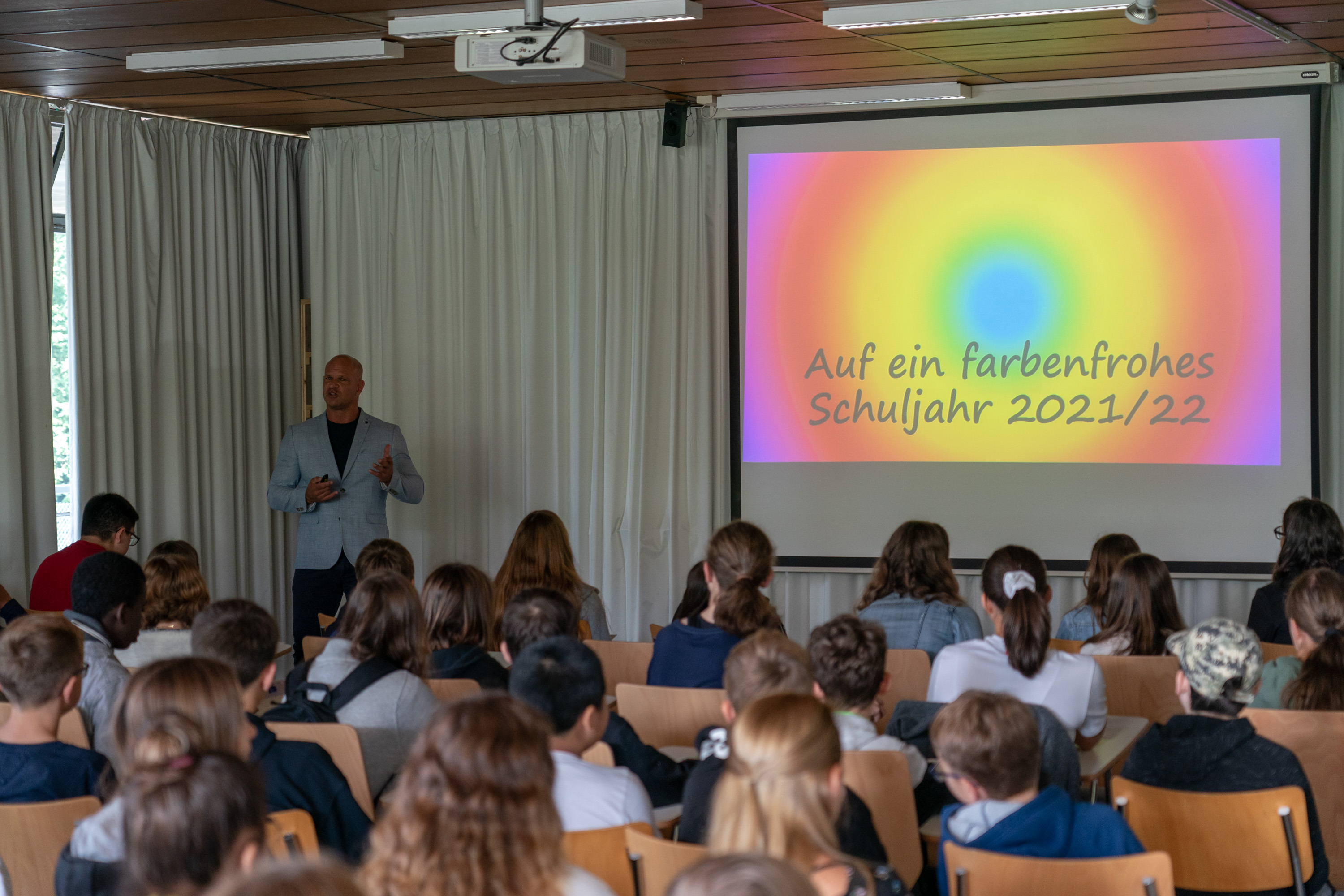 Wie jedes Jahr wurden die neuen Oberstufenschüler an der Suhrenmatte mit einer Begrüssungsfeier empfangen. Unter dem Motto "Auf ein farbenfrohes Schuljahr 2021/22" hiess der Schulleiter Patrik Brack die neuen Schüler und Schülerinnen willkommen und versüsste allen den Start mit einer Packung Smarties.