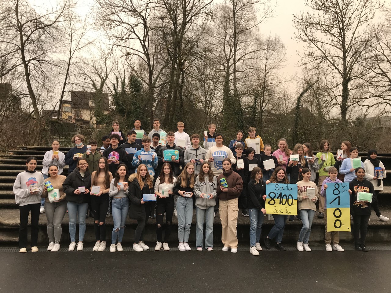 Als der Krieg ausbrach, fehlten uns allen die Worte. Die ganze Klasse wollte behilflich sein, doch wie können zwei Klassen aus der Schweiz einem Land helfen, das vom Krieg betroffen ist?Unsere Klassenlehrkäfte, Herr Amrein, Frau Rahn und Frau Fehlmann kamen auf die Idee, mit der ukrainischen Botschaft in Bern Kontakt aufzunehmen. Rasch erhielten wir eine Antwort, in der sie uns sagten, dass die medizinische Versorgung der Bevölkerung in der Ukraine eingeschränkt sei. Also haben wir uns entschieden, dass beide Klassen gemeinsam einen Sponsorenlauf organisieren und mit dem gespendeten Geld zum einen medizinisches Verbrauchsmaterial kaufen und zum anderen Geld spenden würden.Dank der grosszügigen Sponsoren haben wir die erfreuliche Summe von 8100 Fr sammeln können.Nach dem Lauf haben wir uns an die Arbeit gemacht: Am 8.3.2022 machten sich die Schüler und Schülerinnen auf den Weg und baten Apotheken um medizinisches Verbrauchsmaterial. Wir möchten uns bei den grosszügigen Apotheken im Raum Aarau für ihre Unterstützung bedanken, insbesondere auch für das viele Material, das uns gratis zur Verfügung gestellt worden ist.Als wir genügend gesammelt hatten, gingen vier Abgeordnete der beiden Klassen, begleitet von Herrn Blunier, nach Bern an eine Abgabestelle und brachten die Hilfsmittel den Mitarbeitern der ukrainischen Botschaft. Die Waren werden dann an die ukrainische Grenze gefahren.Im Namen der beiden Klassen danken wir allen, die uns unterstützt haben und es ermöglichen, den Menschen auf der Flucht und im Krieg helfen.(Von Isabela Anchieta Bispo)