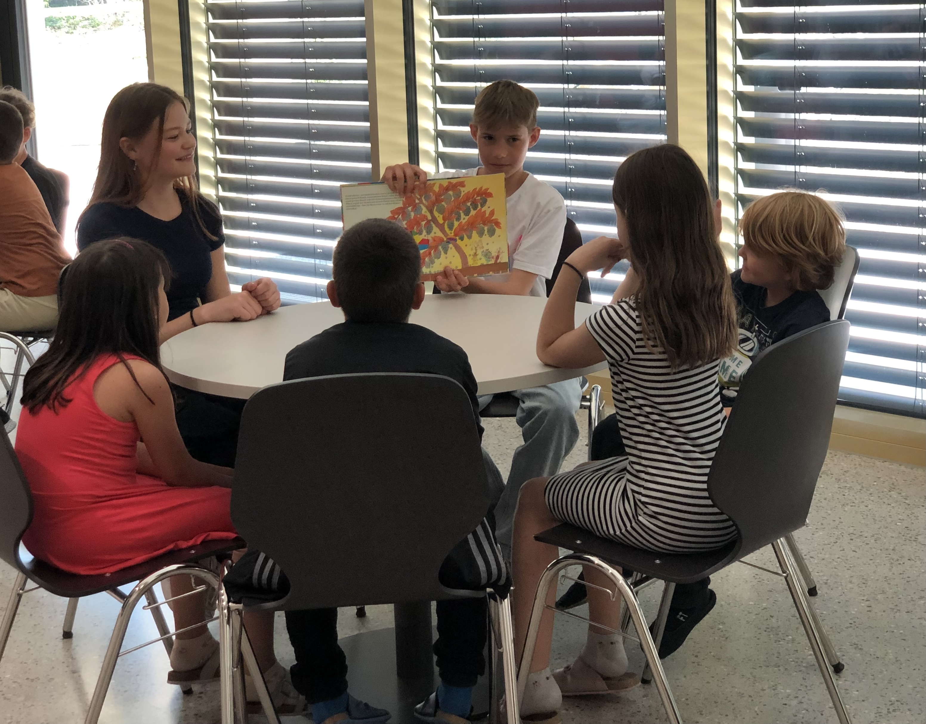 Oberstufenschüler:innen lesen Erstklässler:innen Kinderbücher vor.