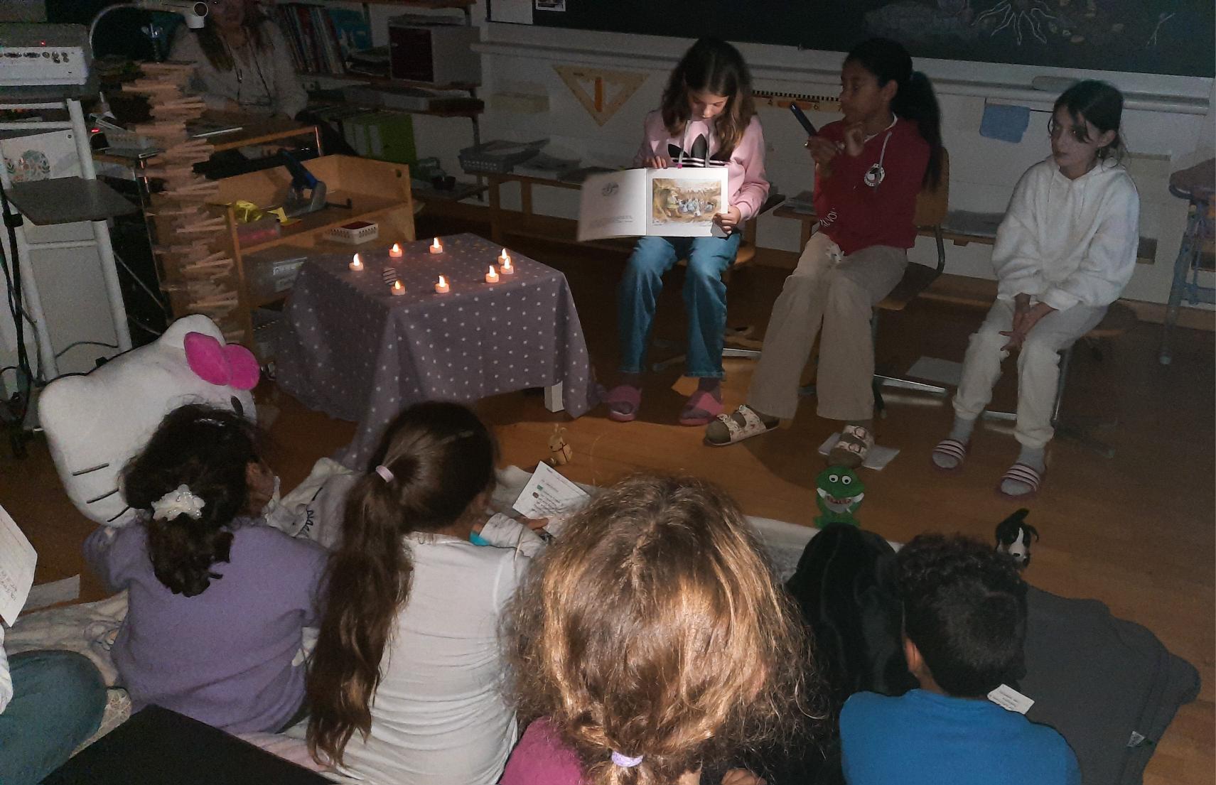 Beladen mit Decken, Stofftieren und Kissen betraten die Kinder mit freudiger Erwartung das Telli-Schulhaus. In den gemütlich eingerichteten und dekorierten Schulzimmern durften die Kinder unterschiedlichsten Geschichten lauschen. Jedoch waren nicht nur Lehrpersonen als Erzähler und Erzählerinnen im Einsatz. Ein besonderer Dank gilt den Schülerinnen und Schülern der 6. Klassen: In der vergangenen Woche hatten sie in kleinen Teams das Erzählen eines Bilderbuchs vorbereitet und eingeübt. Sie haben mit ihren packenden und spannenden Geschichten den jüngeren Kindern eine grosse Freude bereitet.