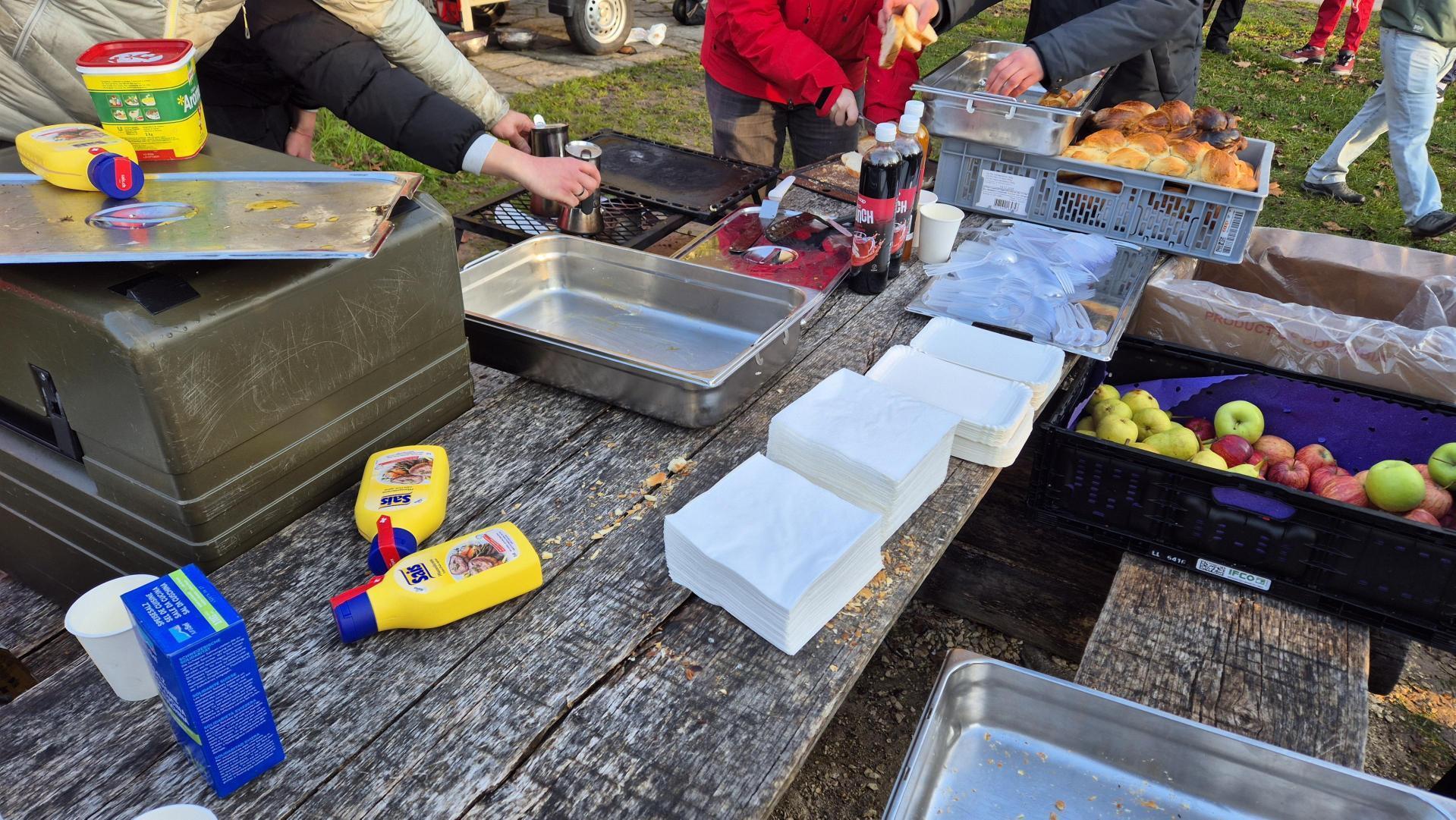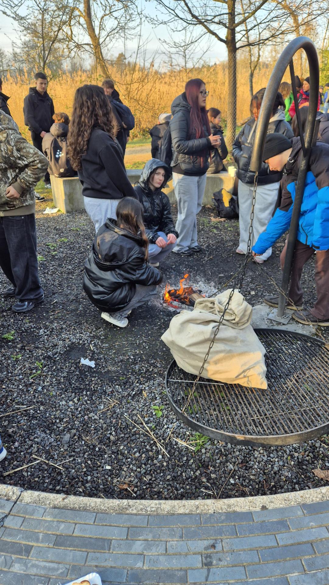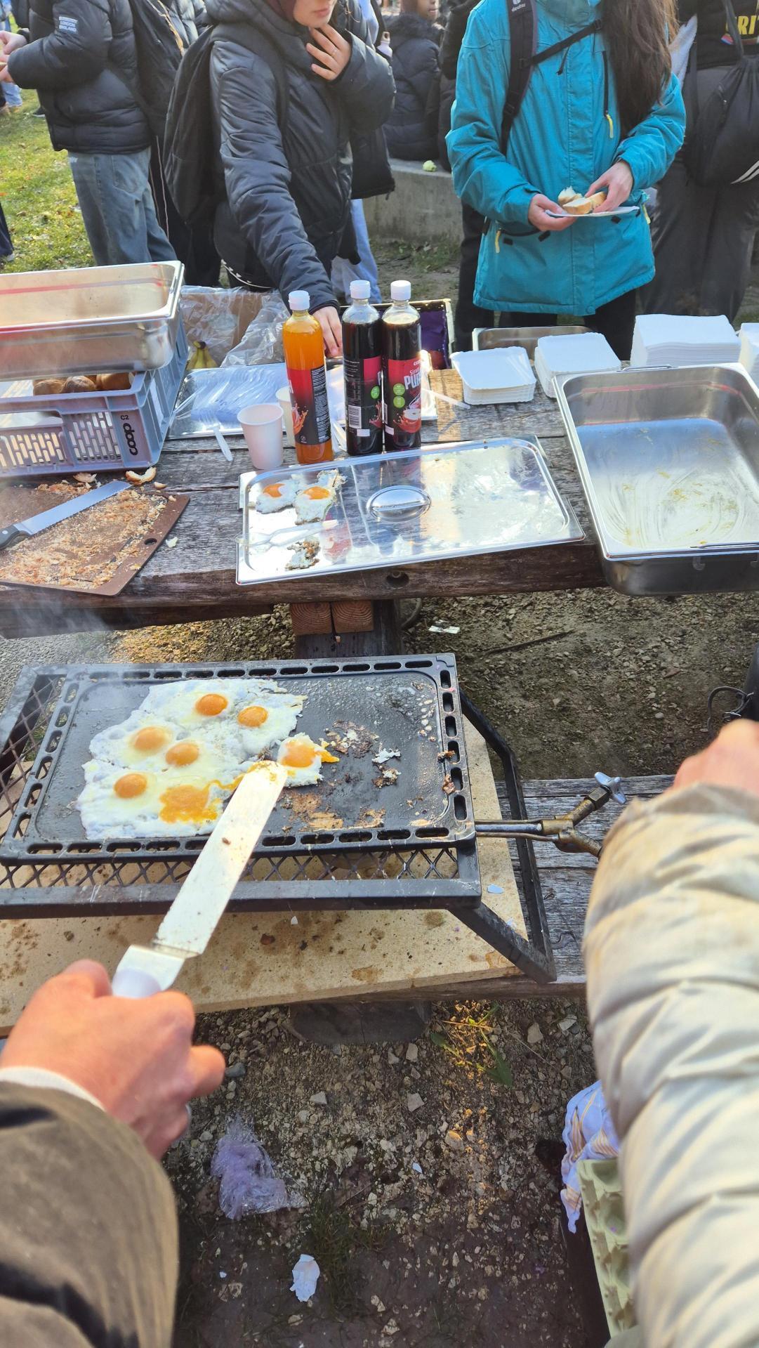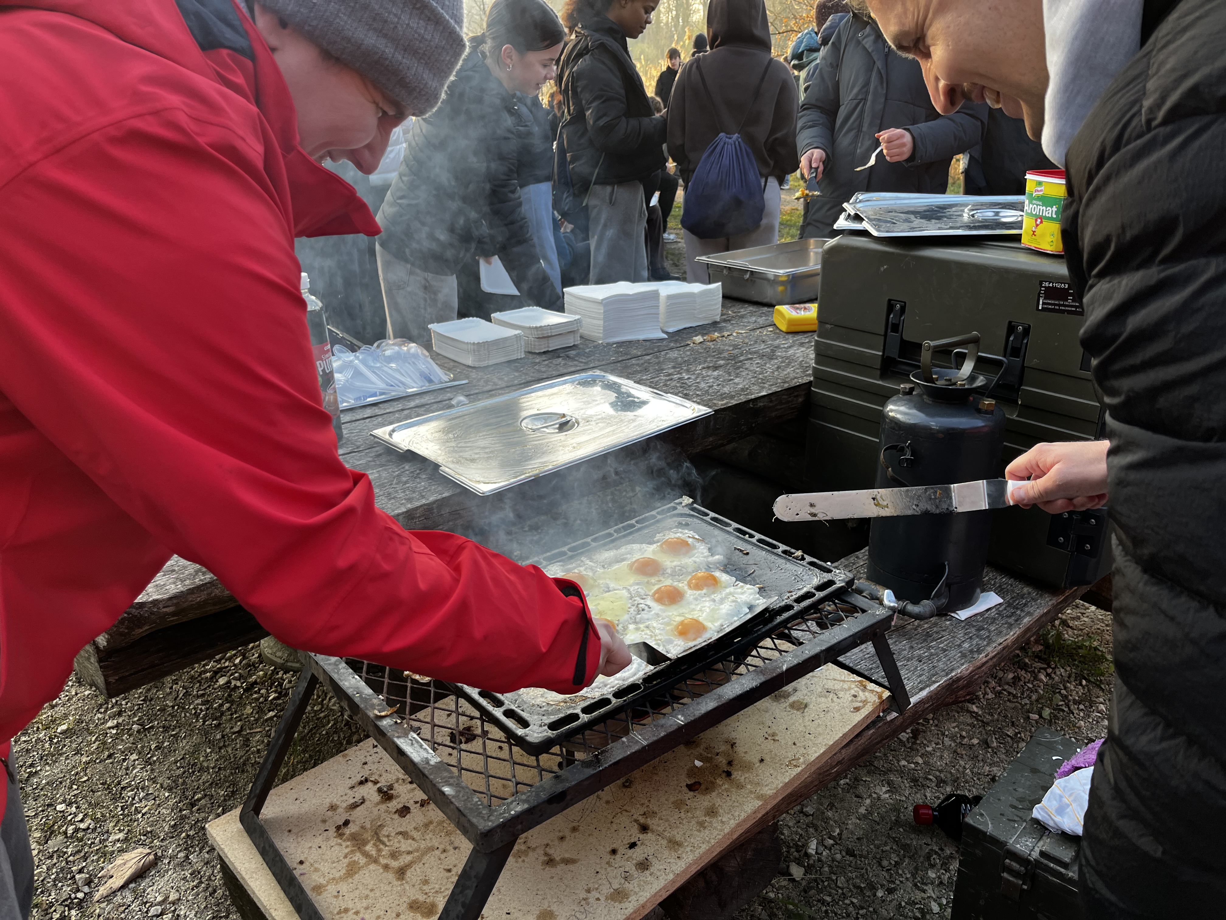 Ein Team von Lehrpersonen und der Schulleitung erwartete die Gruppen unterwegs an einer Verpflegungsstelle und versorgte alle mit frisch zubereiteten Spiegeleiern – eine willkommene Stärkung.