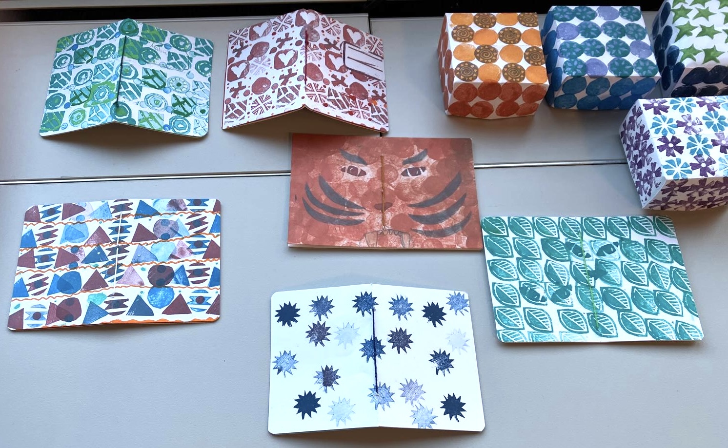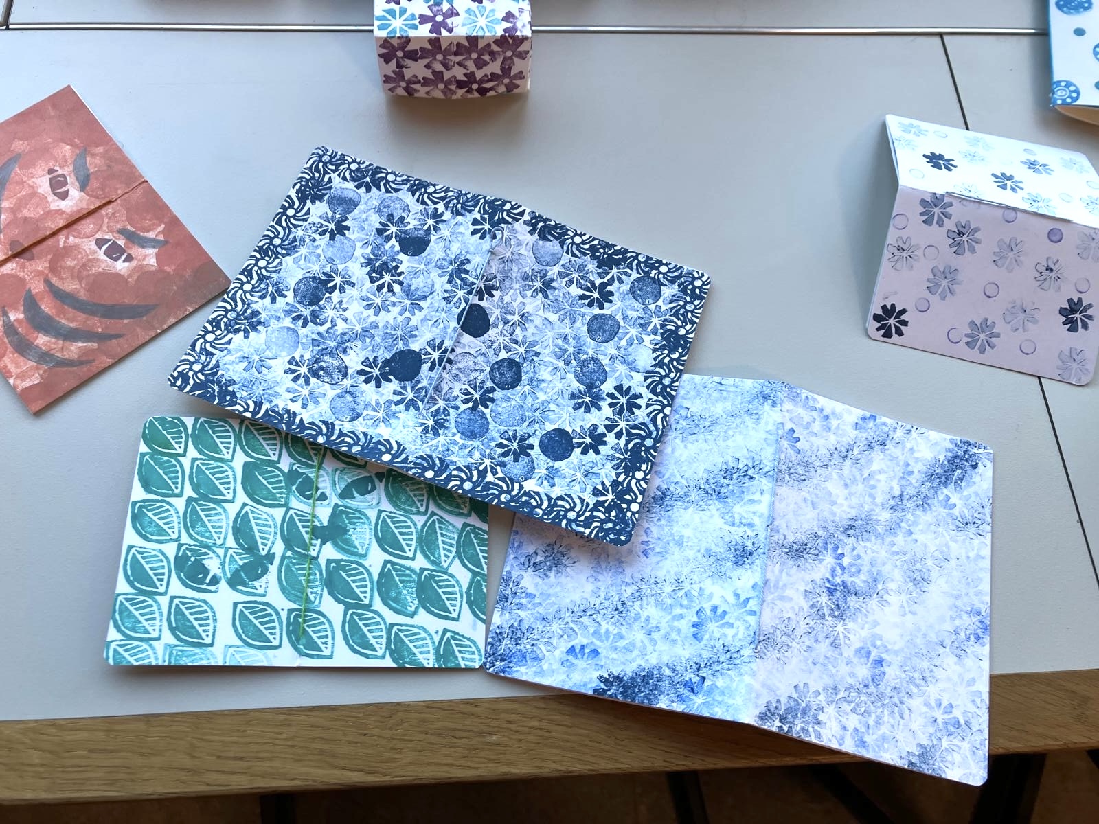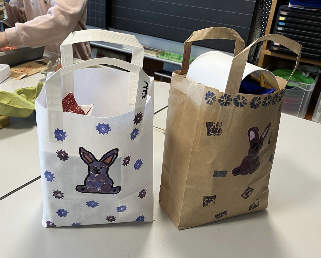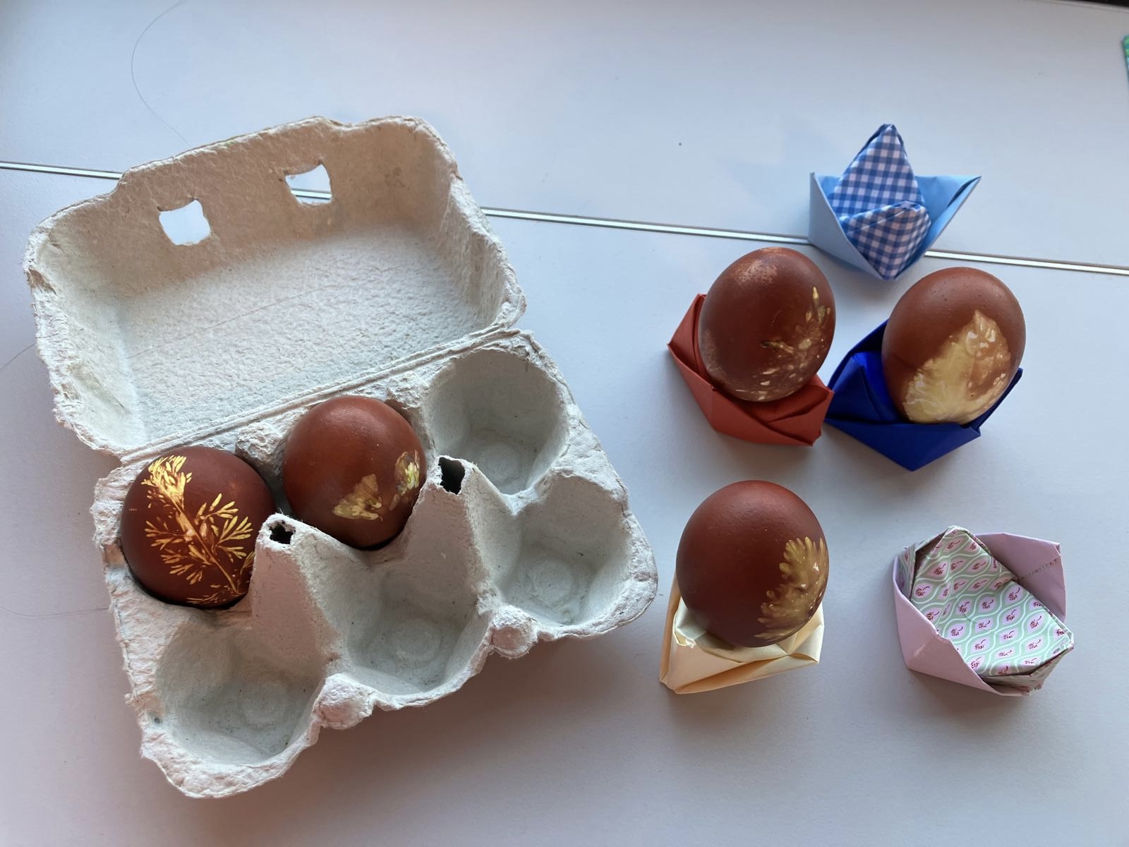 Aus Radiergummis schnitzten wir unsere eigenen kleinen Stempel, für die wir eine selbst bestempelte Schachtel falteten. Mit den eigenen Stempeln bedruckten wir auch Hefte in verschiedenen Grössen. Einige Kinder gerieten dabei in einen regelrechten Produktionsrausch. Am Montag, als wir zum Bauernhof spazierten, um Eier zu kaufen, meinte es das Wetter nicht so gut mit uns. Aber am Mittwoch, beim Kräutersammeln, war es besser und wir konnten unsere Ostereier ganz traditionell mit Kräutern und Zwiebelschalen färben. Am Donnerstag bedruckten wir eine Papiertüte, in der jedes Kind seine Sachen nach Hause nehmen konnte. Es war eine gelungene Woche, mit motivierten, zufriedenen Kindern.