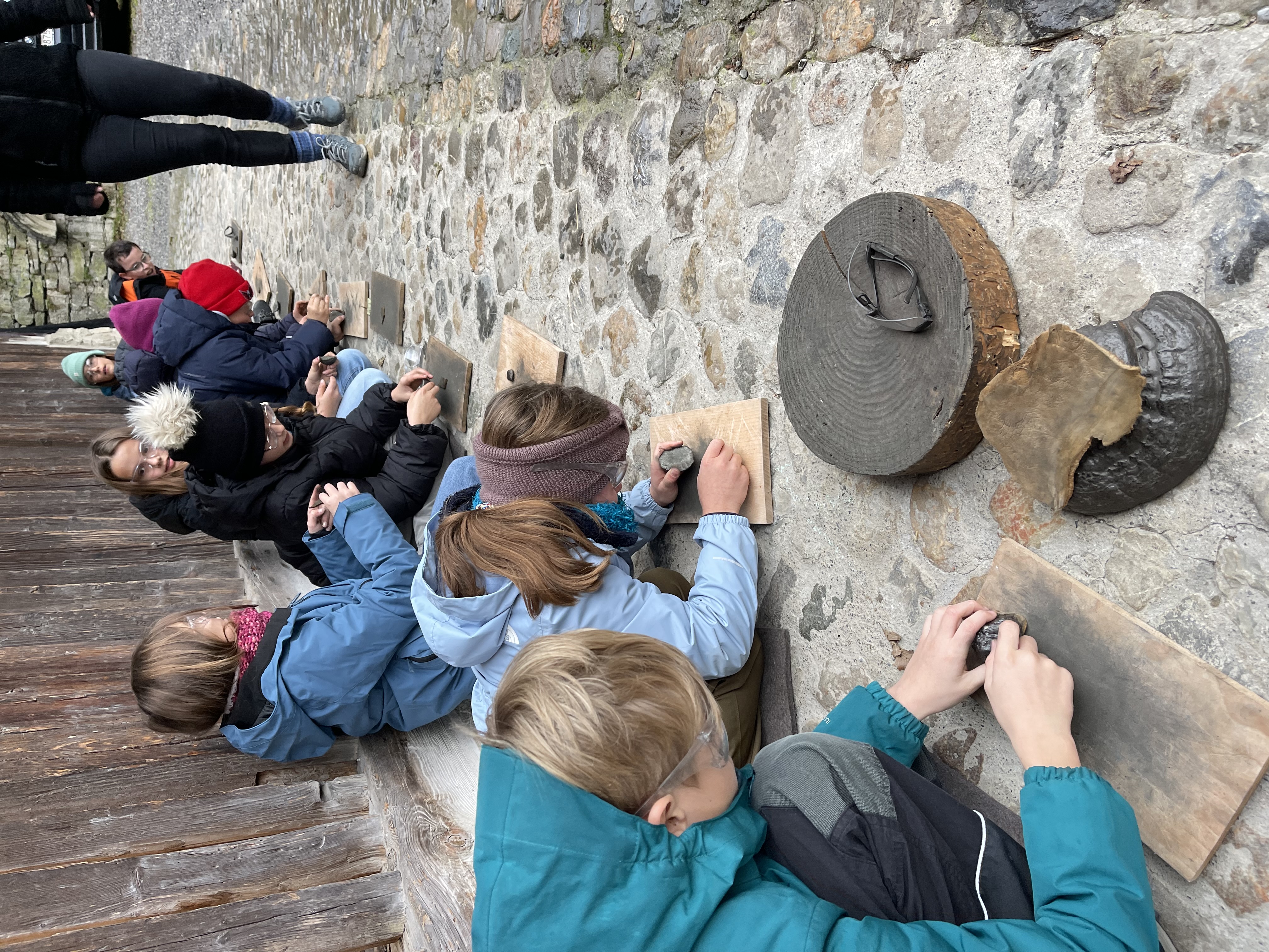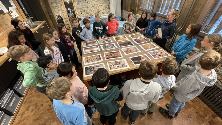In der museumseigenen Werkstatt probierten die Schülerinnen und Schüler das Feuerschlagen aus und gestalteten ihr eigenes Höhlenbild mit Pigmentfarben. Das ungünstige Wetter machte es schwierig, ein Feuer zu entzünden. Umso mehr freuten sich die Kinder über jeden Funken, den sie mit viel Geduld hervorlocken konnten. Die Kinder stellten sich dabei vor, wie herausfordernd es für die Menschen der Steinzeit gewesen sein muss, unter Kälte und Nässe ein lebenswichtiges Feuer zu entfachen.