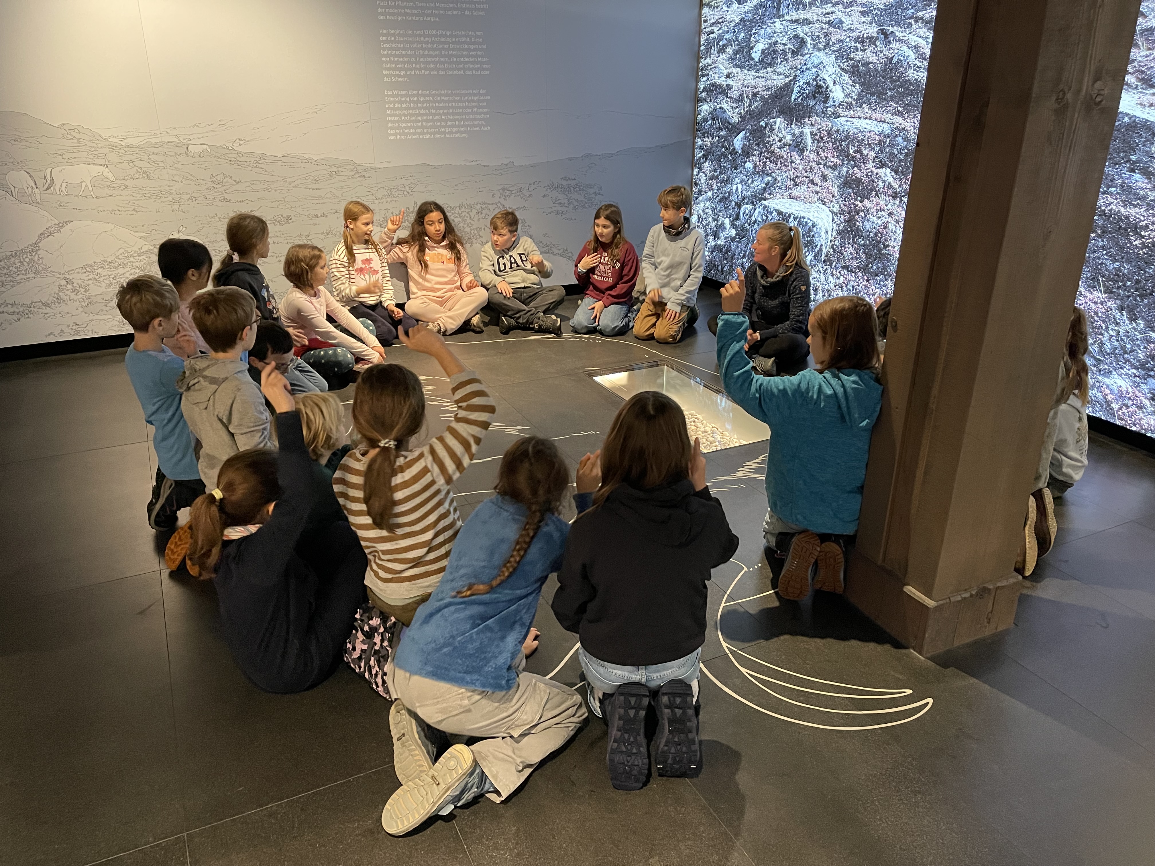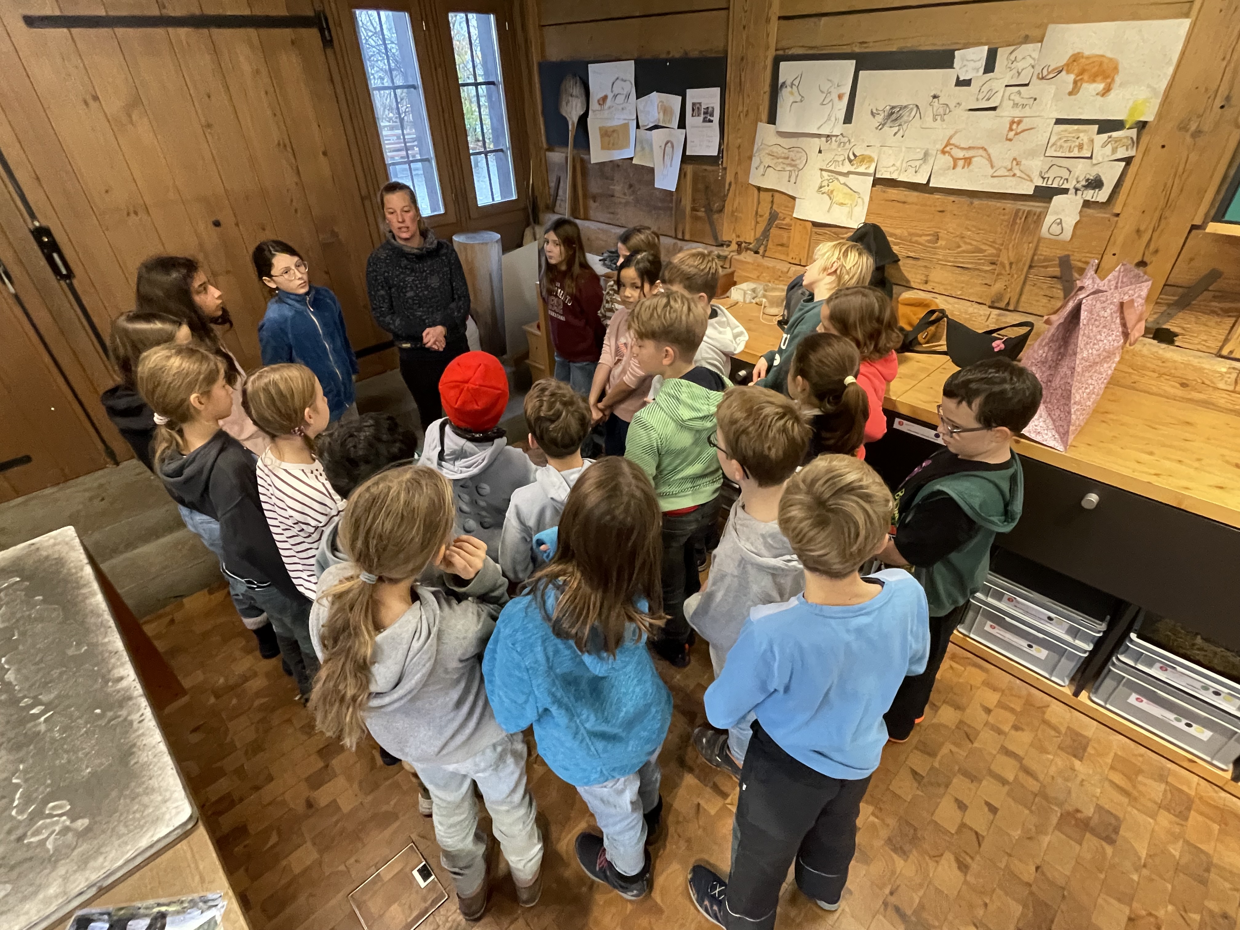 Im Rahmen des NMG-Themas «Altsteinzeit» besuchte die Klasse 4b am vergangenen Mittwoch das Museum Burghalde in Lenzburg. Im Workshop «Feuer und Licht» machten sich die Kinder auf eine spannende Reise in den Alltag altsteinzeitlicher Jäger. Sie lernten, wie die Menschen damals lebten, welche Hilfsmittel sie nutzten und welche Fähigkeiten sie beherrschen mussten, um in der Natur zu bestehen. Durch Originalfunde und anschauliche Nachbildungen wurde die Führung besonders greifbar – die Neugier der Kinder war sofort geweckt.